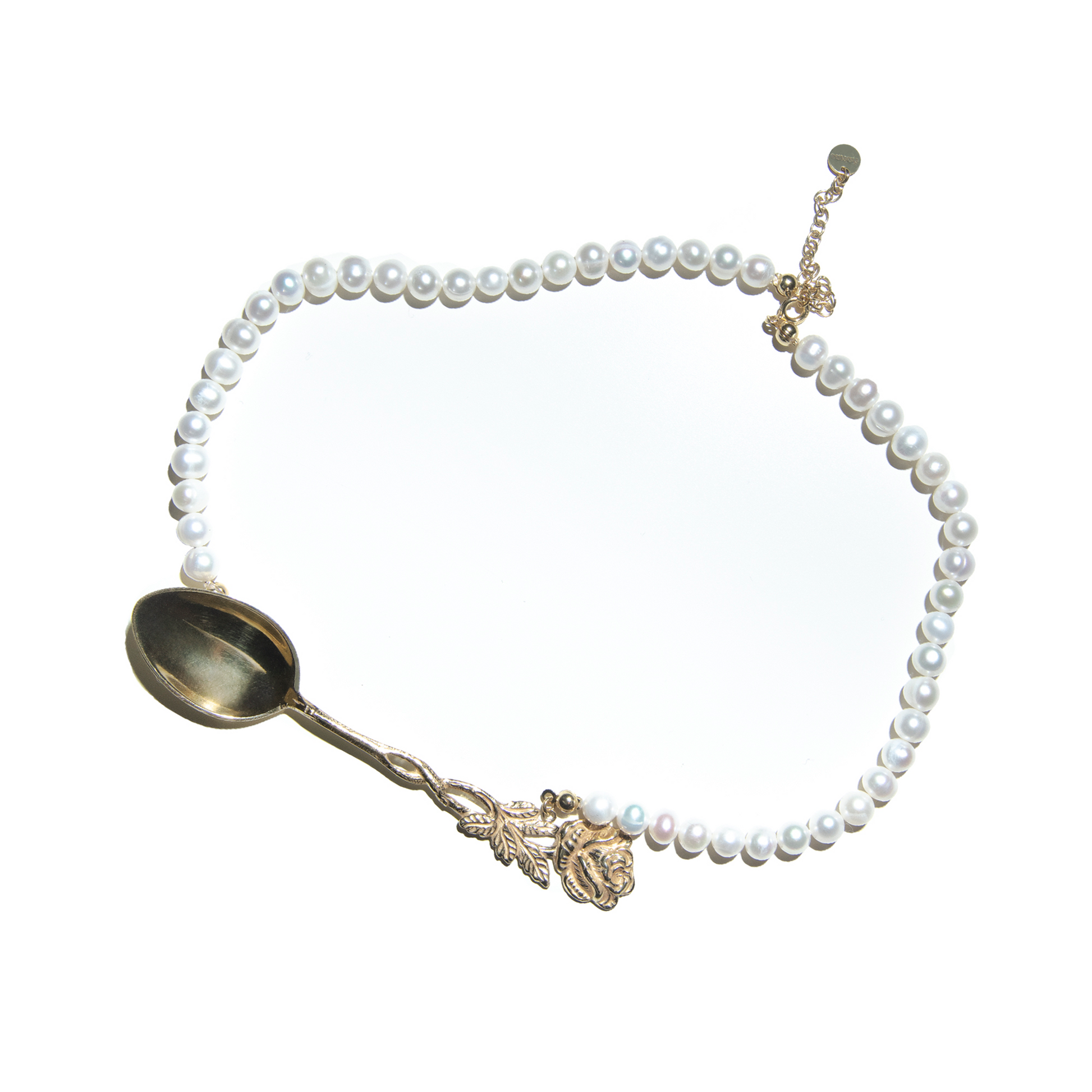 Naszyjnik z zawieszką - łyżką, wykonaną z pozłacanego srebra, naszyjnik z pereł hodowlanych